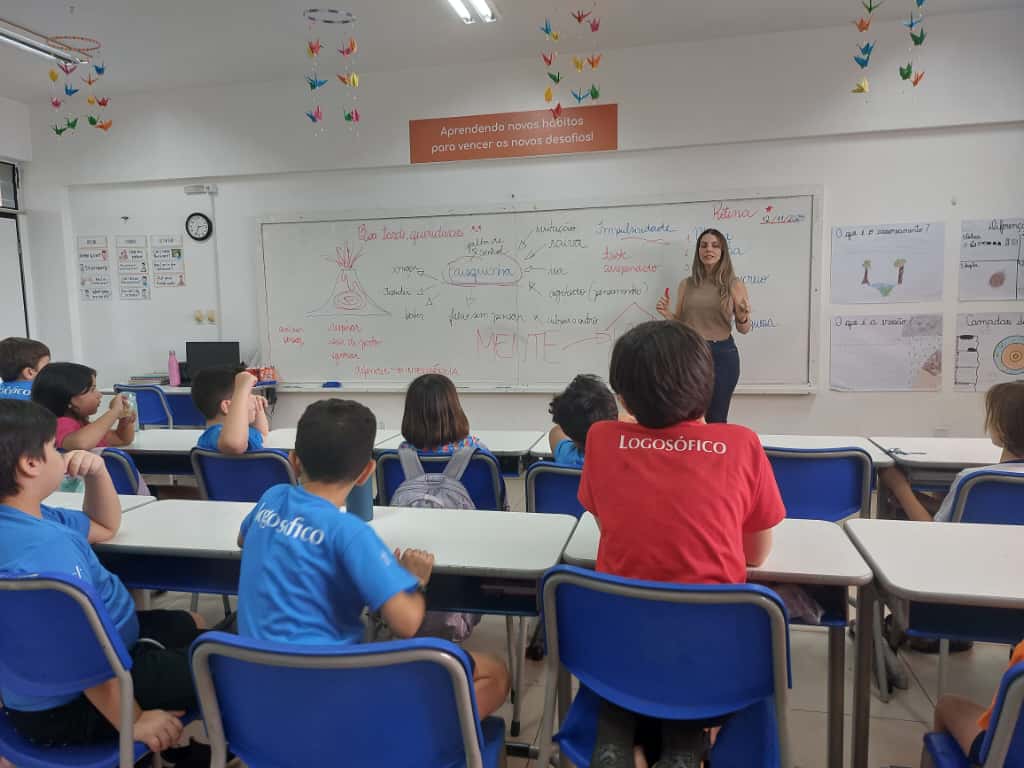 Após as apresentações, a assessora educacional Tatiana Moro conduziu uma roda de conversa que relacionou os vulcões ao pensamento Faisquinha, conceito logosófico que representa a impulsividade. A comparação ajudou os alunos a compreender que, assim como um vulcão entra em erupção repentinamente e pode causar danos ao seu redor, o Faisquinha leva a atitudes impulsivas movidas por raiva, ciúmes ou impaciência, afastando as pessoas e prejudicando a convivência.
